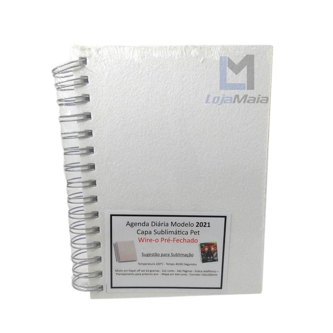 AGENDA DIÁRIA EM WIRE-O SUBLIMÁTICA - Wire-o Pré Fechado - Sugestão para Sublimação = Temperatura 200ºC | 40/60 segundos - Miolo de Agenda Diária - 2x2 Cores - 342 páginas - Off-set 63g com Mapa 4x4 Cores - Índice Telefônico - Planejamento - Formato da Agenda 145x200mm.