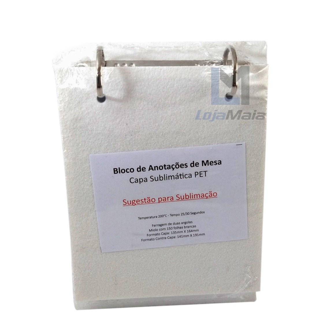 Bloco de Anotações de Mesa - Capa Sublimática PET - Sugestão para Sublimação - Temperatura 200°C - Tempo 40/60 Segundos - Ferragem de duas argolas - Miolo com 150 folhas brancas - Formato Capa: 135mm X 164mm - Formato Contra-Capa: 141mm X 191mm.
